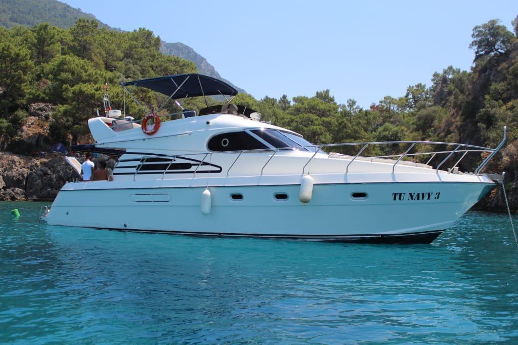 Моторная яхта с TU NAVY3 с двумя каютами, шикарным салоном, террасой для загорания, навесом от солнца и обеденной зоной покорит ваше сердце.