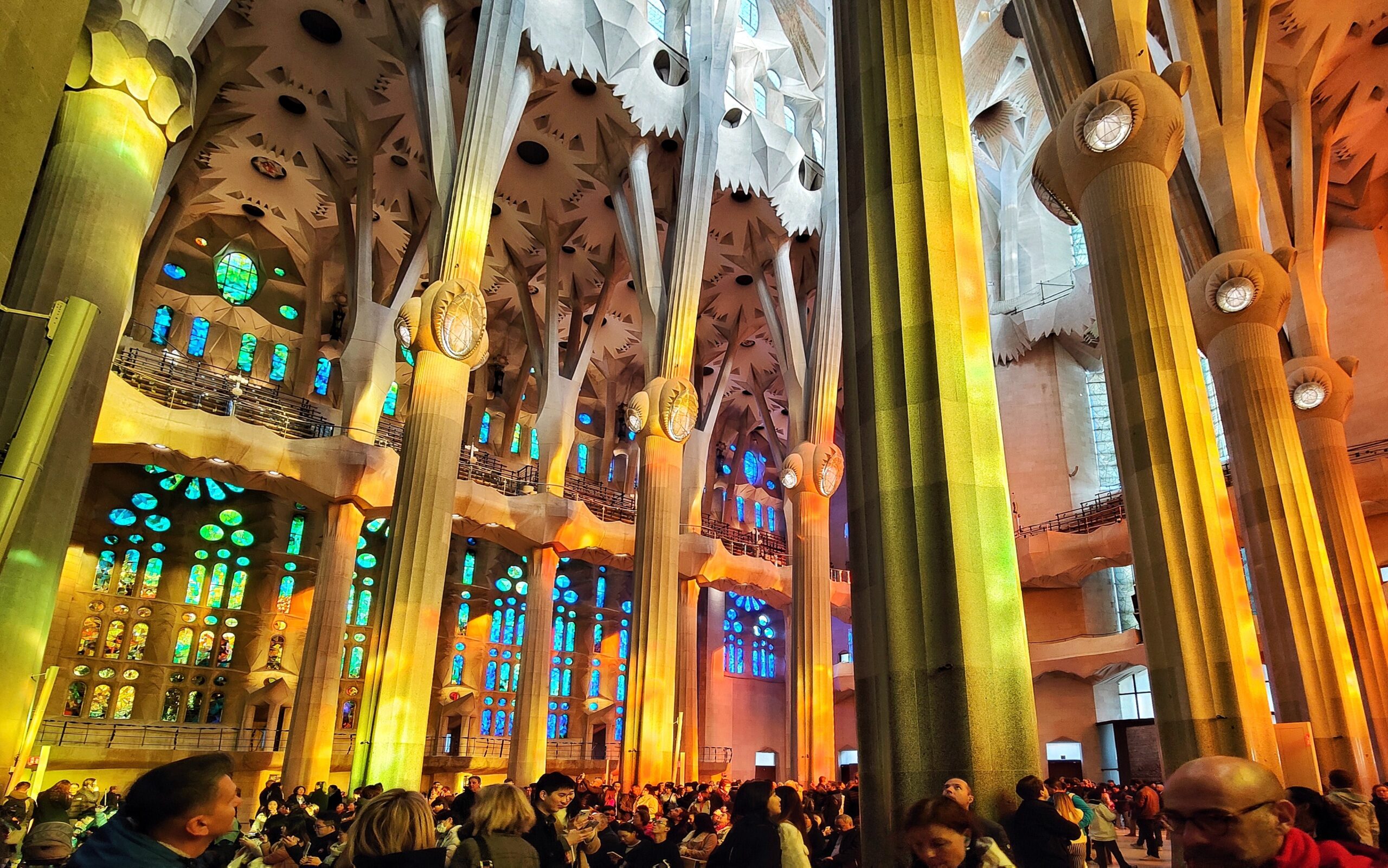 Но Саграда Фамилия интересна не только снаружи, но и внутри. Ее основное пространство выполненно в виде стилизованного леса из платанов — деревьев, которыми засажена основная часть улиц Барселоны. Разноцветные колонны разного диаметра расходятся в своей верхней части на ветки-нервы, поддерживающие своды из объемных мозаичных листьев, сквозь которые пробиваются лучи солнца. Проемы заполнены яркими витражами, благодаря которым пространство залито тысячами разноцветных бликов.