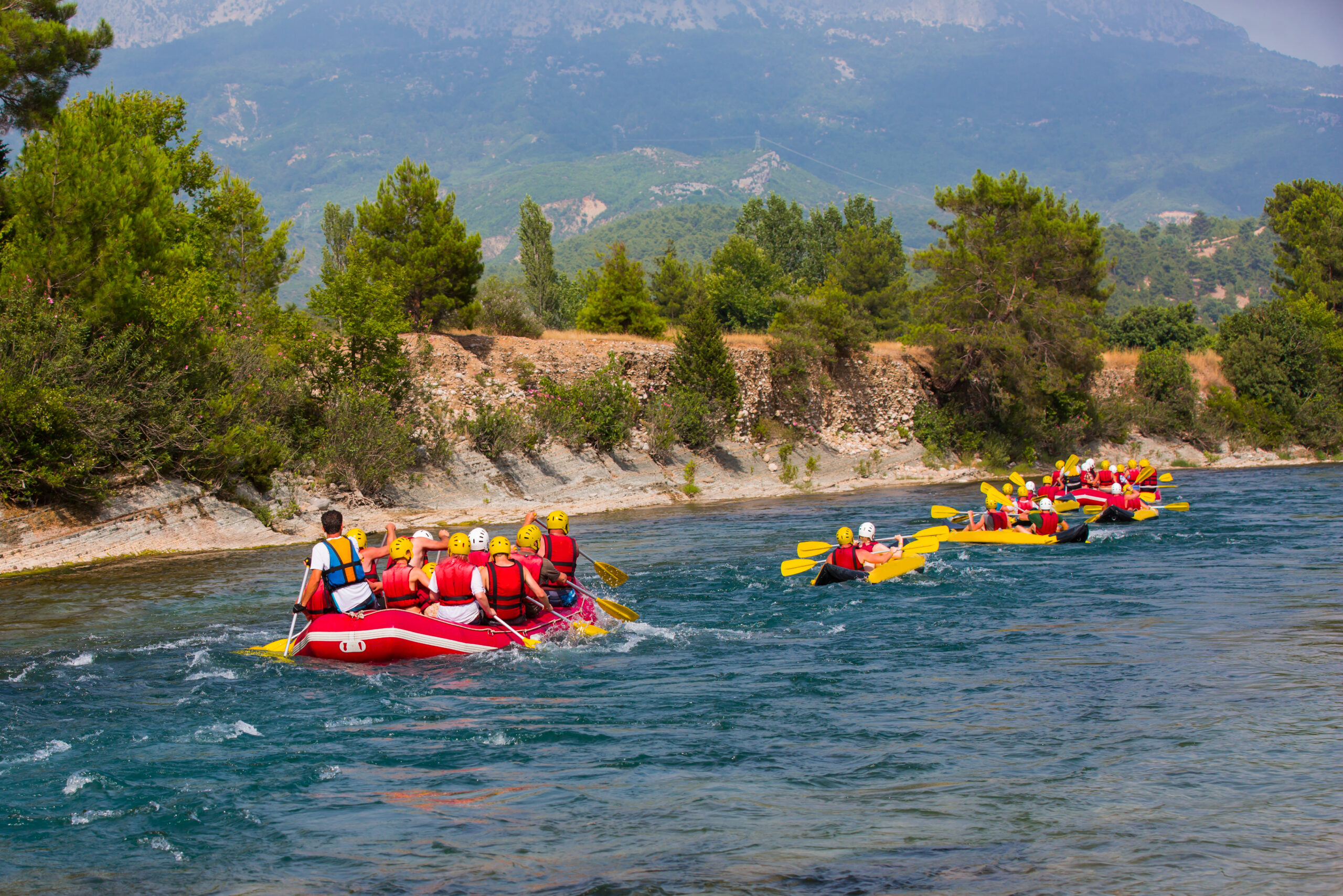 Старт — с утреннего трансфера из отелей Антальи, Белека, Сиде, Аланьи и Кемера. Гости собираются на базе сплава, где гиды проводят инструктаж и знакомят с маршрутом. Затем начинается путешествие на кабриолетах — открытые машины везут гостей к каньону Тазы. Это одна из самых впечатляющих точек в горах Тавр: почти полчаса на то, чтобы застыть в восторге перед пропастью и сделать десятки кадров.