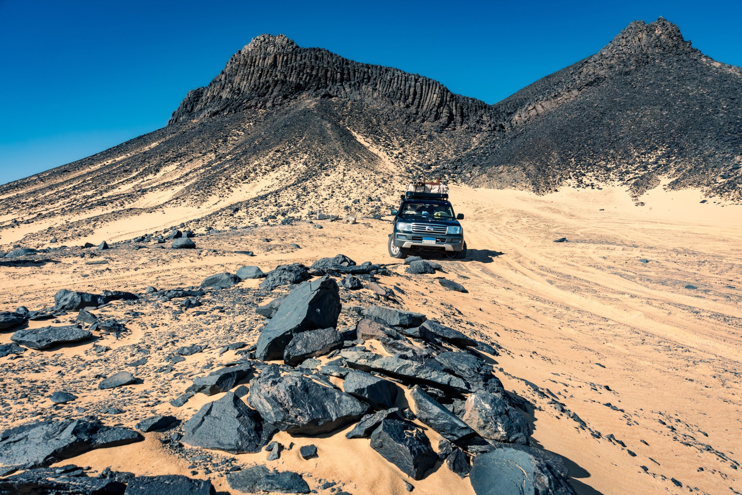 Позавтракав, отправимся на джипе в Черную пустыню — не менее удивительный заповедник Египта, где некогда существовал вулкан Туфу. Сейчас этот уникальный объект с вулканическими холмами и черным песком похож на другую планету.