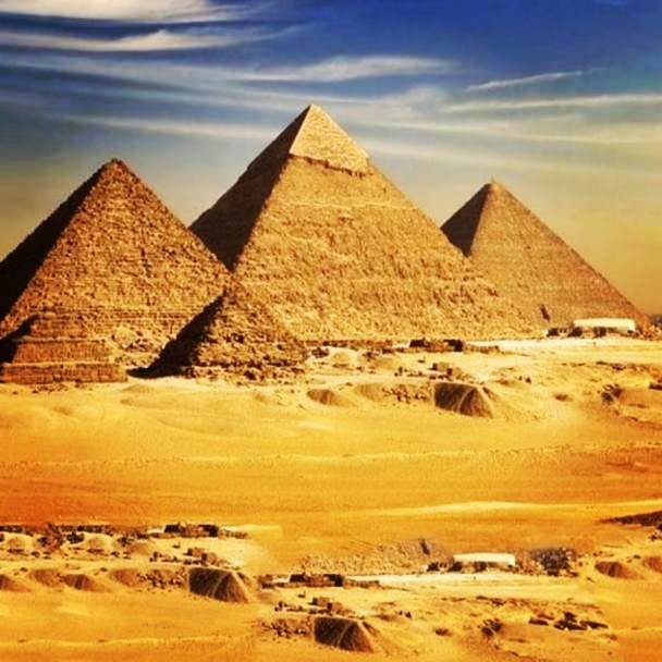 2 — пирамиды в Гизе: Хеопс, Хефренос, Микринос и большой сфинкс.