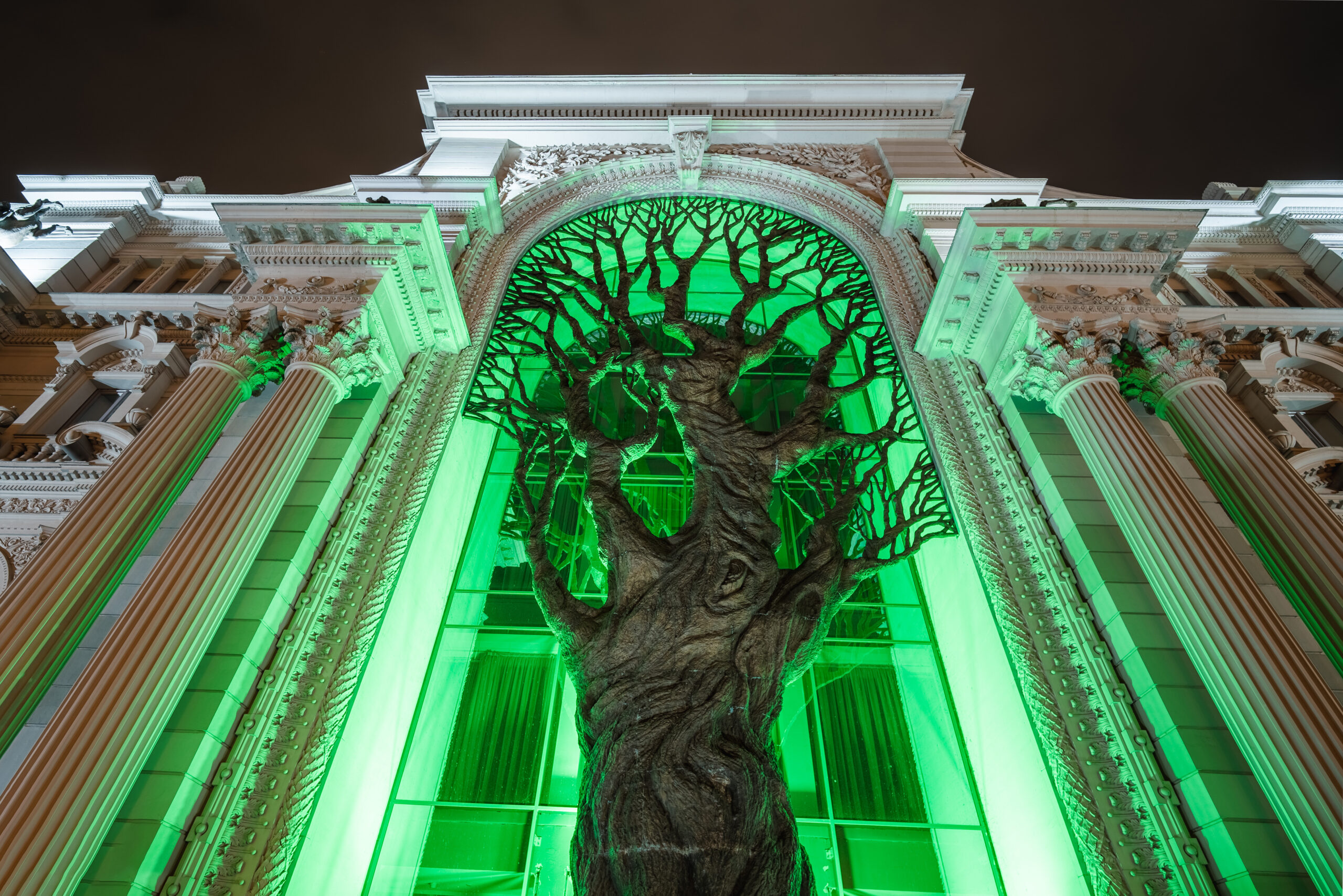 Уникальность Дворцу земледельцев придает огромное 20-метровое бронзовое дерево с корнями и раскидистыми ветвями, символизирующее силу жизни. В вечернее время дворец и бронзовое дерево подсвечиваются зеленым цветом, придавая красивый и мистический облик композиции.