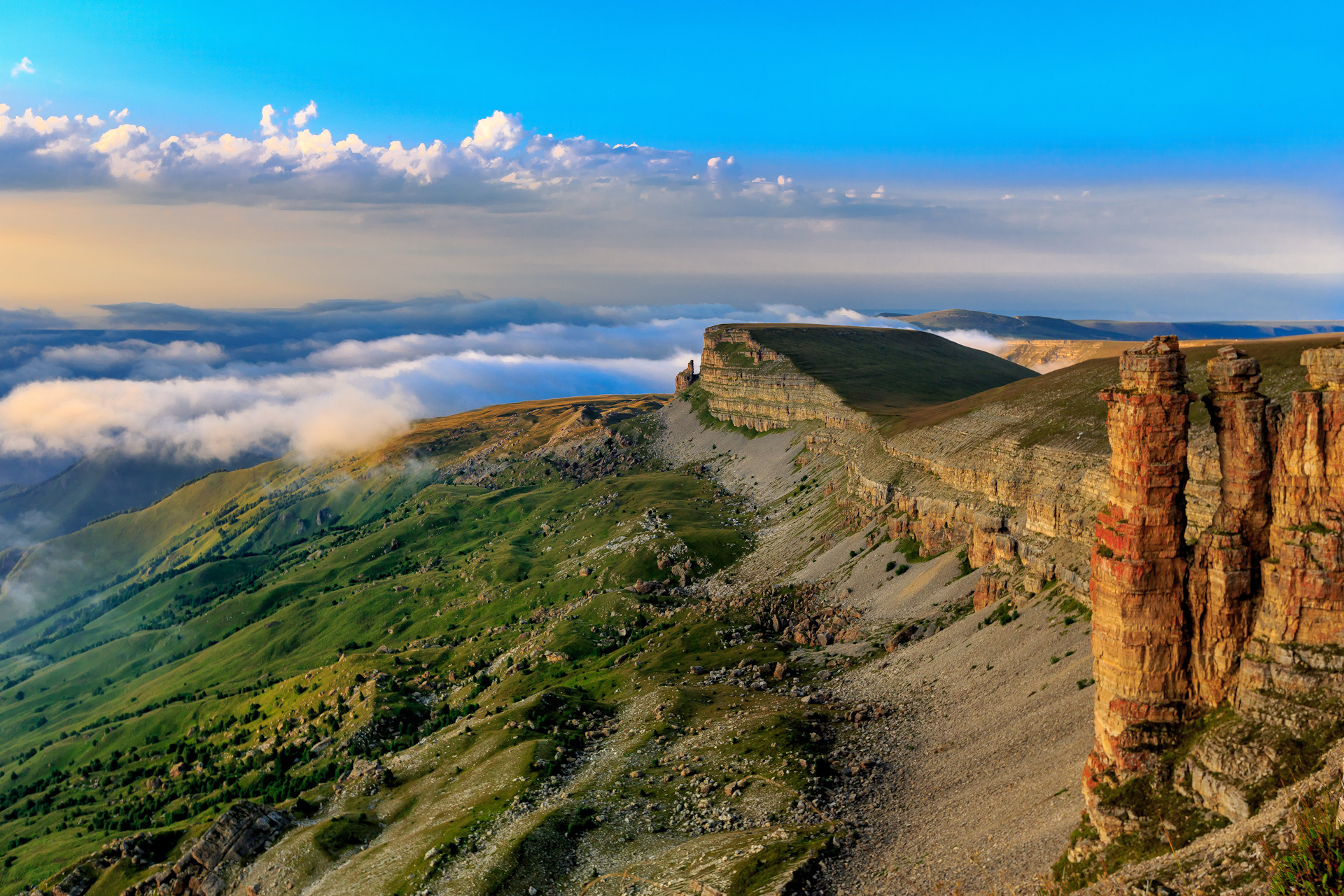 Эльбрус от плато находится всего в 30 км, поэтому кажется, что до него можно подать рукой. А еще здесь потрясающие рассветы и закаты, поэтому лучше подгадать так, чтобы застать один из этих грандиозных моментов.