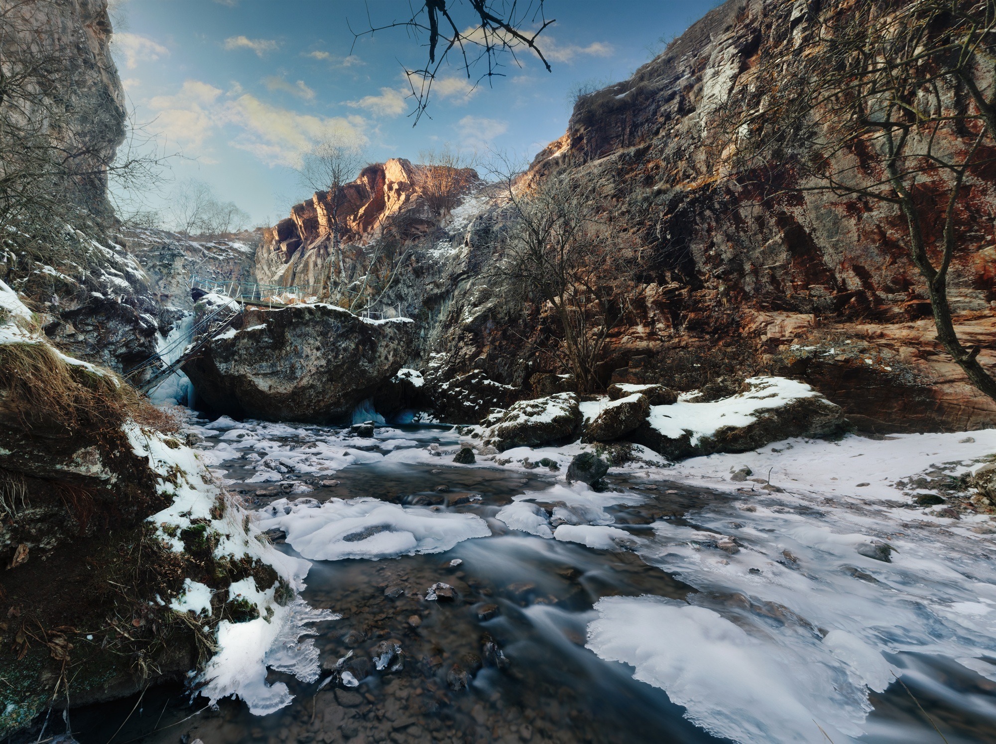 Мы пройдем по крутой лестнице с народным названием «Тёщины рёбра», расположенной в расщелине скалы. Перед вами предстанут водопады: «Жемчужный» высотой 6 метров, «Девичьи косы» и «Чёртова мельница», а самый высокий водопад в ущелье — «Большой Медовый» высотой 18 метров. После прогулки приятно перекусить в национальном кафе и попробовать традиционные блюда карачаевцев — айран и хычин. Также мы заглянем в Чайный домик, где вас ждет дегустация чая на горных травах, меда, варенья, а также, большой выбор сувениров.