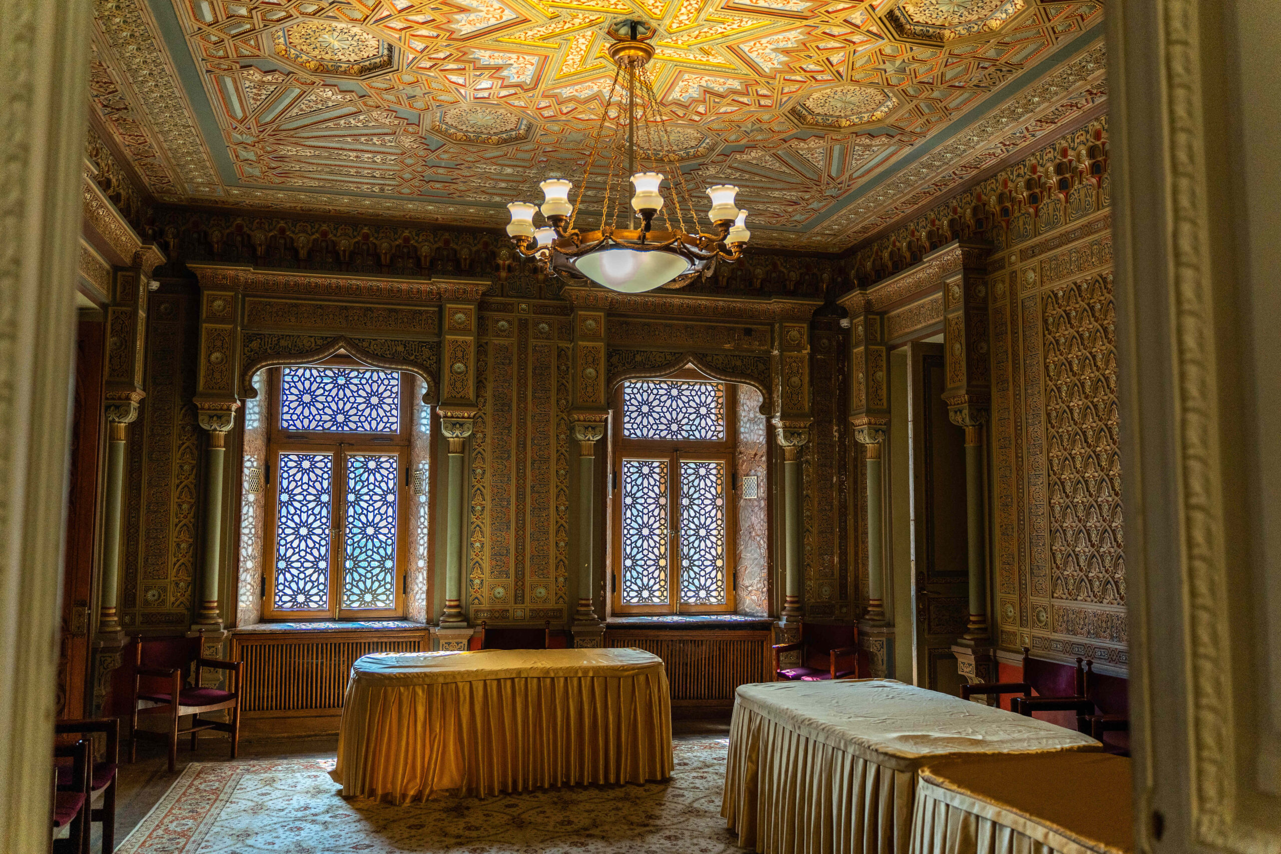 Вы подниметесь по роскошной беломраморной лестнице в «греческий» холл, украшенный мраморными резными колоннами и величественными светильниками в виде сфинксов, посетите самый торжественный белый зал, оборудованный даже потайным лифтом для слуг, побываете в рабочем кабинете Николая Стахеева, в котором сохранились часы с кариатидами, шкаф и зеркало, и в самой оригинальной «мавританской» курительной комнате, каждый сантиметр потолка и стен которой покрыт объемным восточным узором. Вы узнаете, где находились многочисленные тайники, в которых Николай Стахеев спрятал накануне революции свои несметные богатства — золото, драгоценные украшения и брильянты.