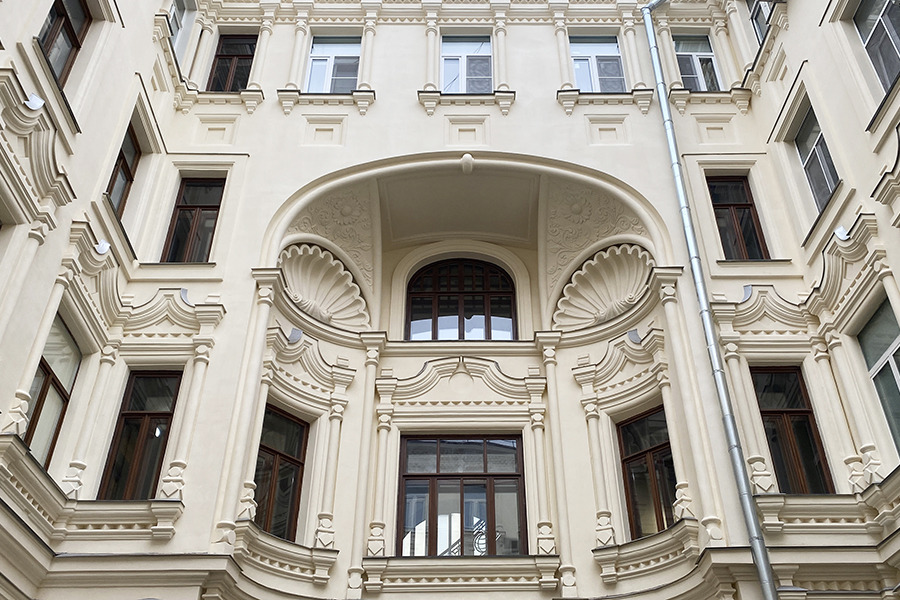 Зайдем вместе с гидом во внутренний двор и подробно рассмотрим изумительный внешний декор дома-терема, пройдем в парадный подъезд с исторической метлахской плиткой, поднимемся по подлинной изогнутой лестнице из доломита с ажурными перилами, увидим окна Фальконье.
