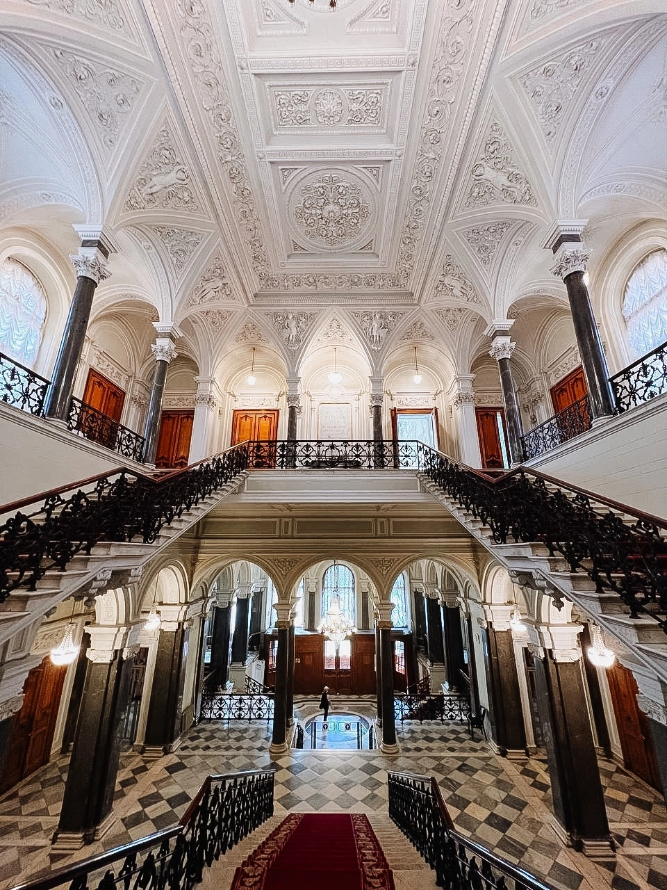 Коринфские колонны, ионические пилястры, барельефы в духе классицизма. Технологии XIX века, опередившие время: первый в городе гидравлический лифт, канализация и телефонная связь. Главный символ — парадная лестница, залитая светом, — идеальная локация для фото и восхищения гением зодчества.
