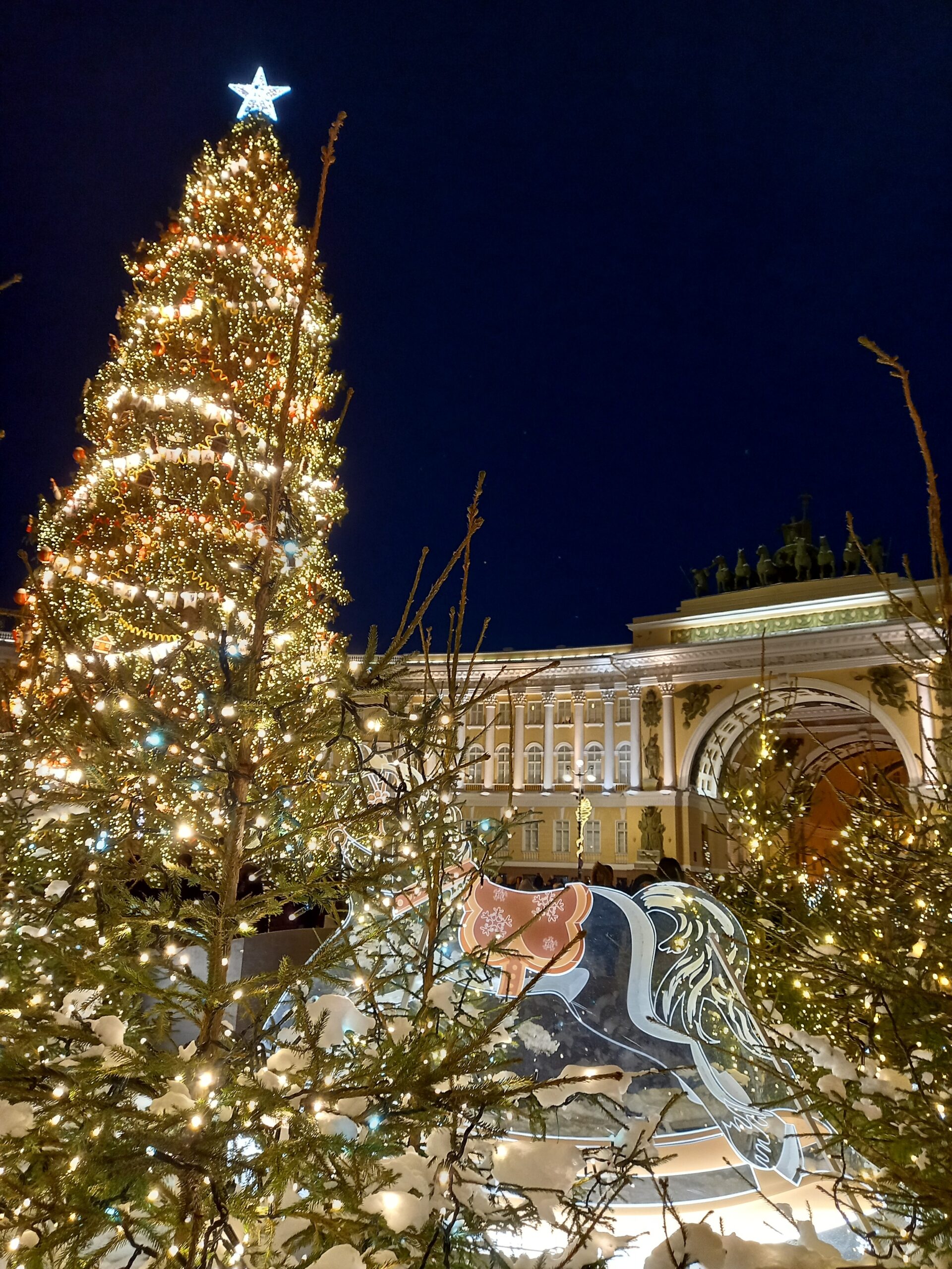 Далее, мы полюбуемся новогодними украшениями на Дворцовой и Исаакиевской площади, где вы подготовлены красивые фотозоны. В пути вы узнаете, когда начали открываться первые елочные базары, почему “салат оливье” — самый новогодний салат и каково происхождение шампанского Лев Голицын.