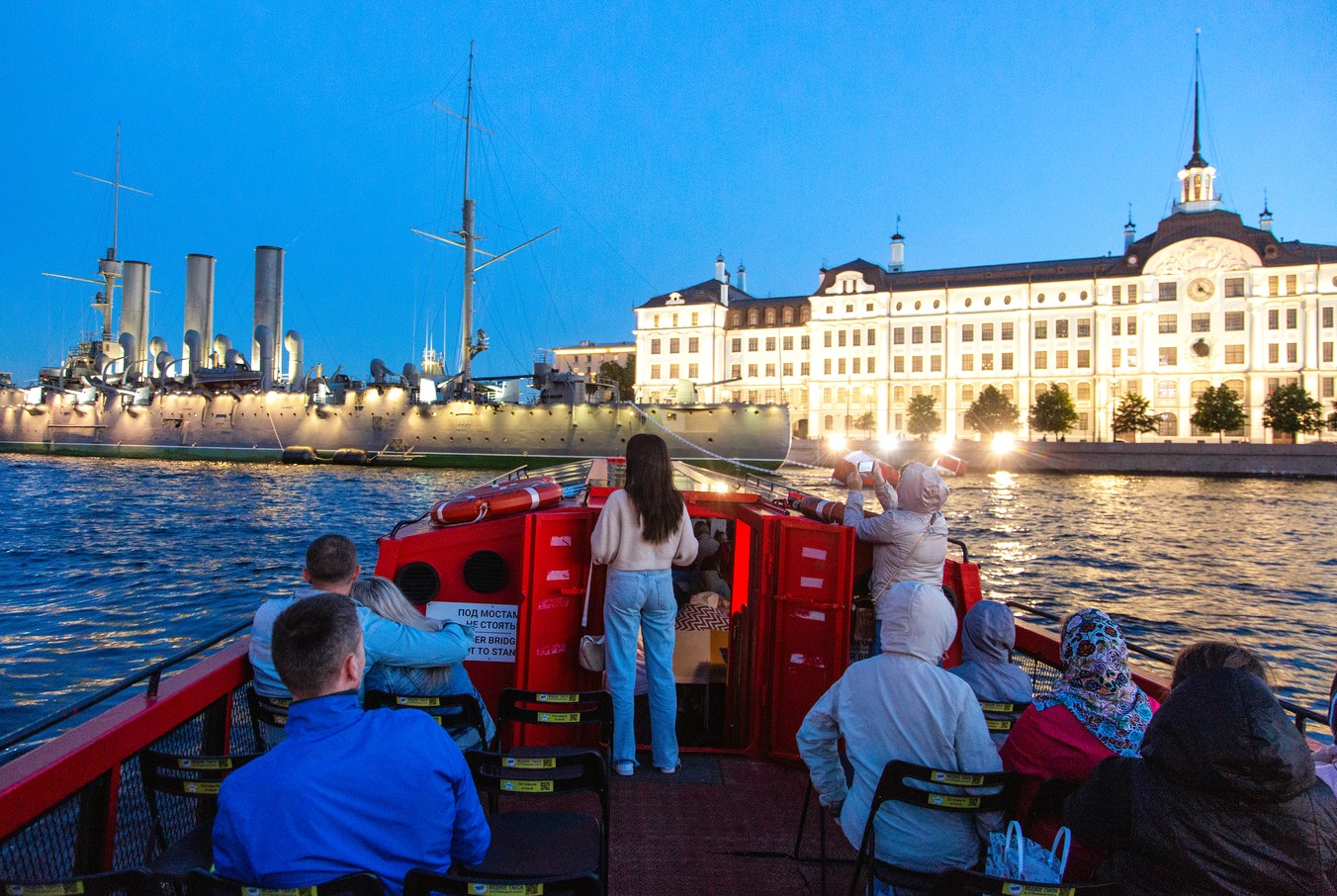 • Наше путешествие начинается у набережных Невы — могучей реки, несущей свои воды через сердце Петербурга. Судно отходит от причала, и перед нами открывается один из самых живописных видов города — Адмиралтейство с его золотым шпилем, отражающим солнечные лучи, и величественный Дворцовый мост, под которым мы медленно проходим, ощущая дыхание истории.