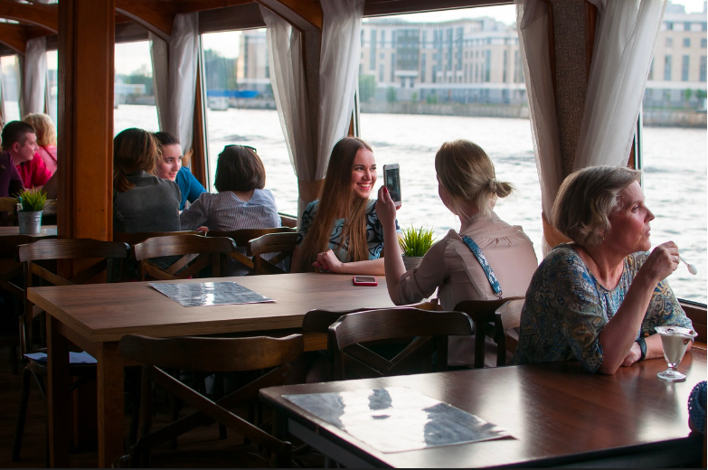 - на борту теплохода можно поужинать с видами на Петербург.