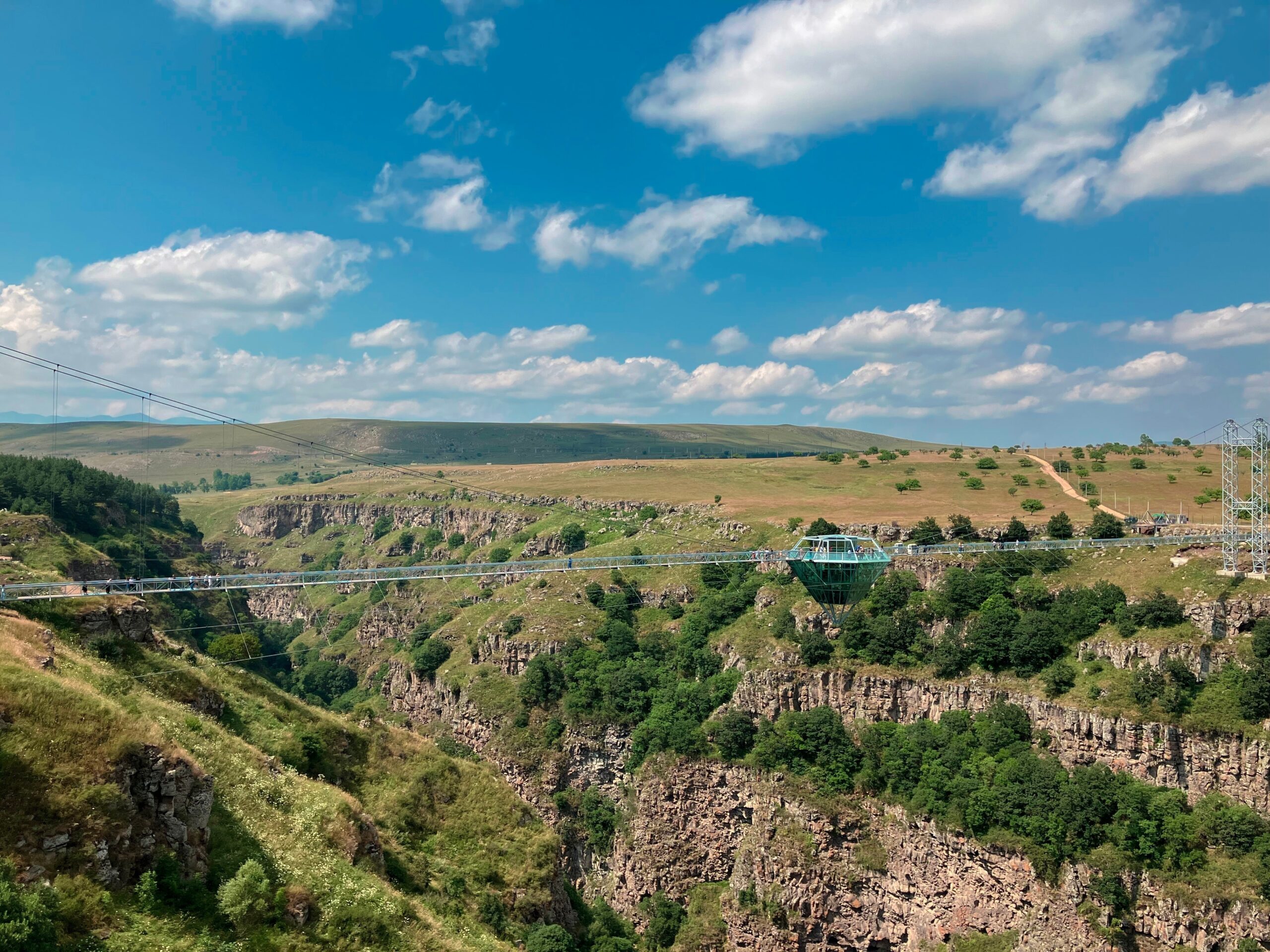 Это уникальное место славится своими базальтовыми скалами, образованными в результате древней вулканической активности, а также кристально чистыми водопадами, которые каскадами стекают по отвесным стенам каньона. Главной достопримечательность маршрута — Хрустальный мост — стеклянная конструкция, парящая над пропастью на высоте более 200 метров, с панорамным кафе в центре. Прогулка по мосту подарит дозу адреналина и захватывающие виды, от которых захватывает дух.