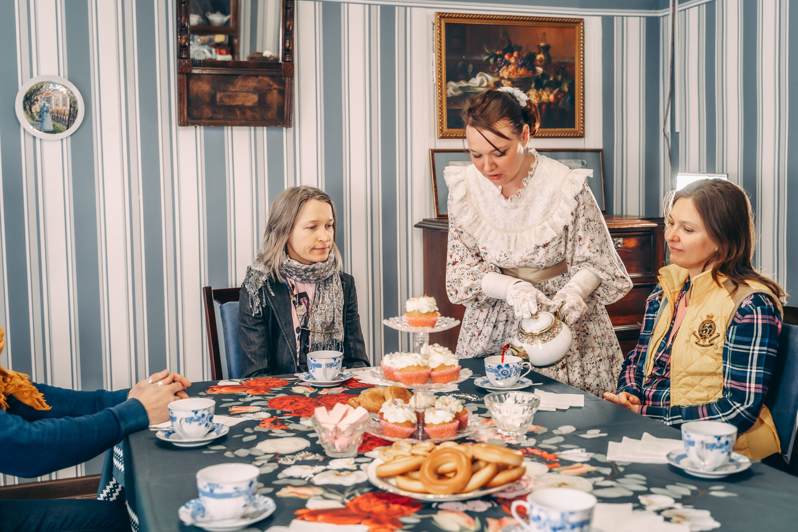 Чаепитие будет проходить в доме купцов Евреиновых, что на Ярославской улице. Он привлечет ваше внимание своим изящным видом: деревянный узор «елочка» на фасаде, резные наличники, фигурное крыльцо. Дом просторный, необычно расположен. Одна часть выходит на тротуар, а вторая спрятана внутри. В те времена в нем собиралась вся городская интеллигенция. Вам будет приятно оказаться в обстановке и интерьерах того времени и почаевничать под рассказы экскурсовода об истории.