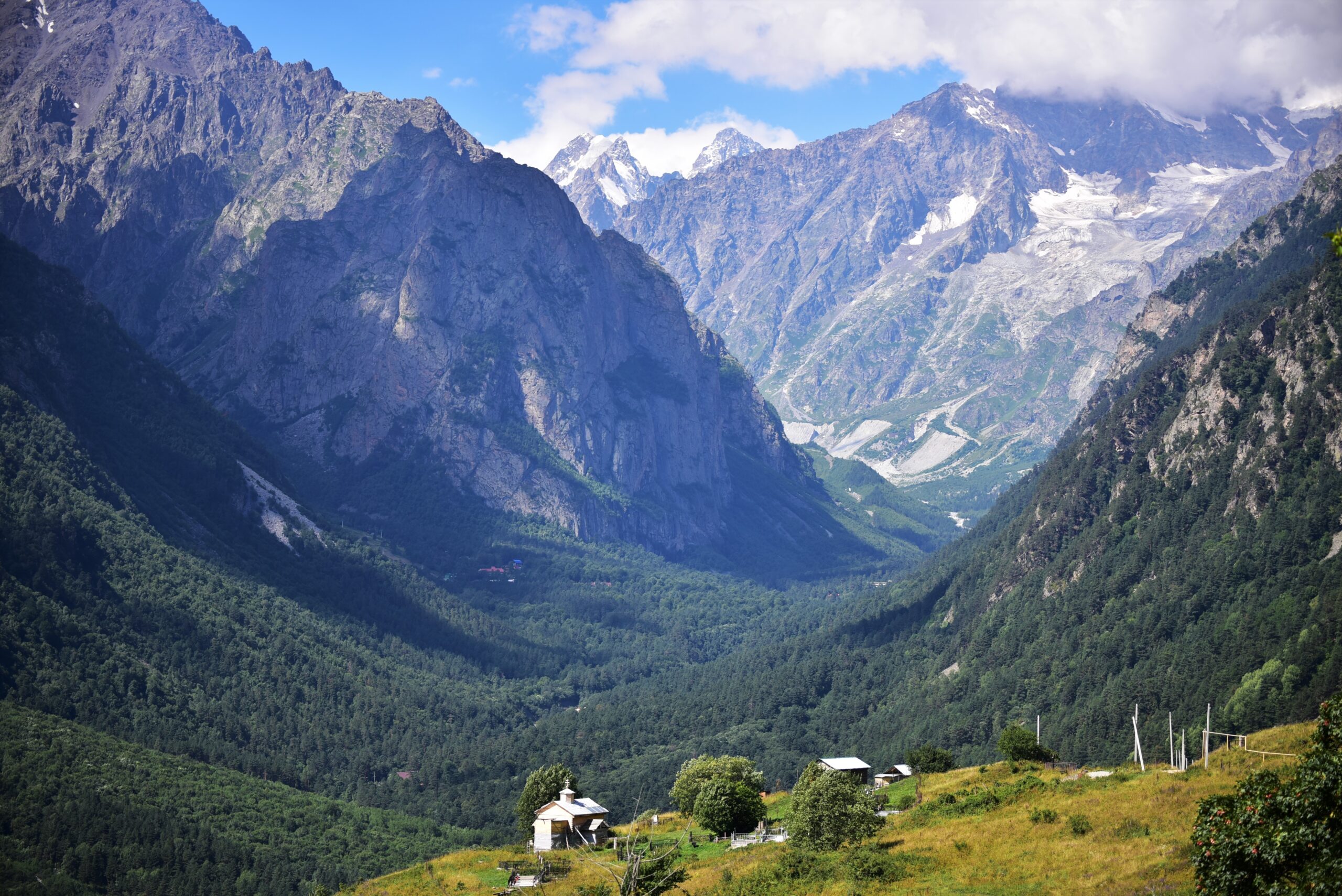 На 10 километре дорога приводит в курортную зону, где расположены гостиницы и базы отдыха. Слева, по ходу движения, сквозь сосновые заросли, просматривается Сказский ледник и горнолыжная трасса на его морене.